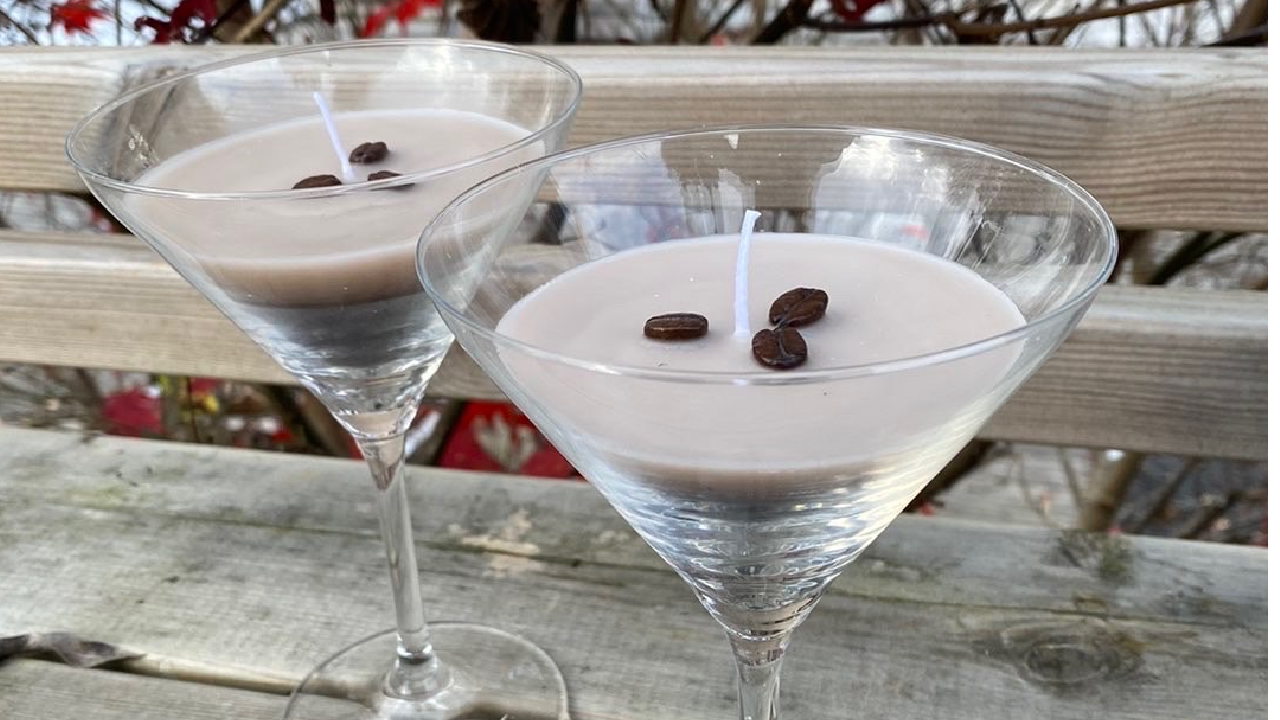 A lit candle inside a glass jar is decorated with eucalyptus leaves and an orange slice. It is placed in a woven basket along with white towels, creating a cozy and warm atmosphere.